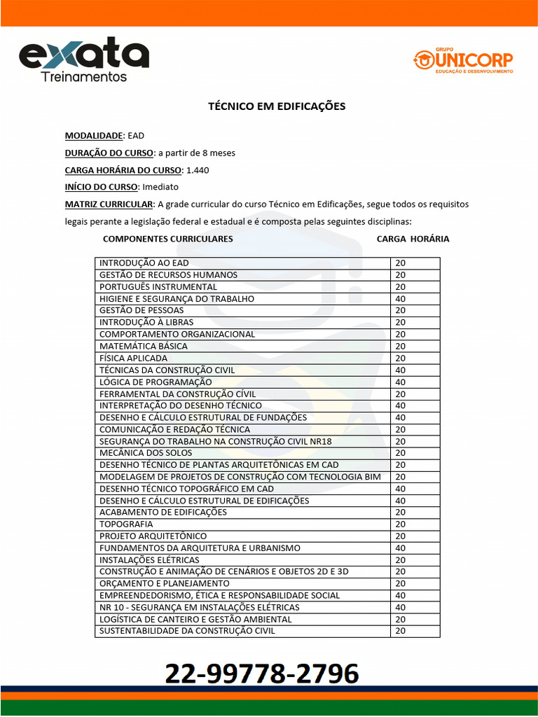 DURAÇÃO DO CURSO: a partir de 8 meses