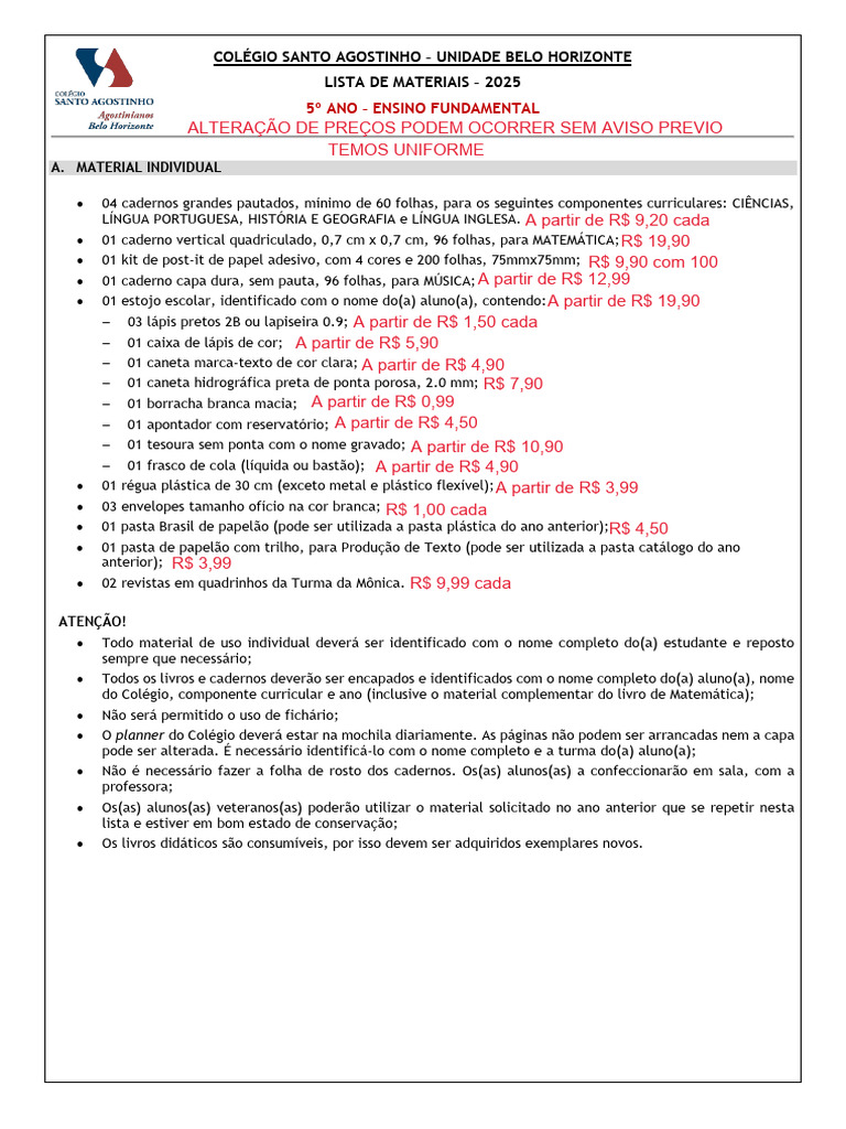 • UNIFORME ESCOLAR: consultar informações no site do Colégio.