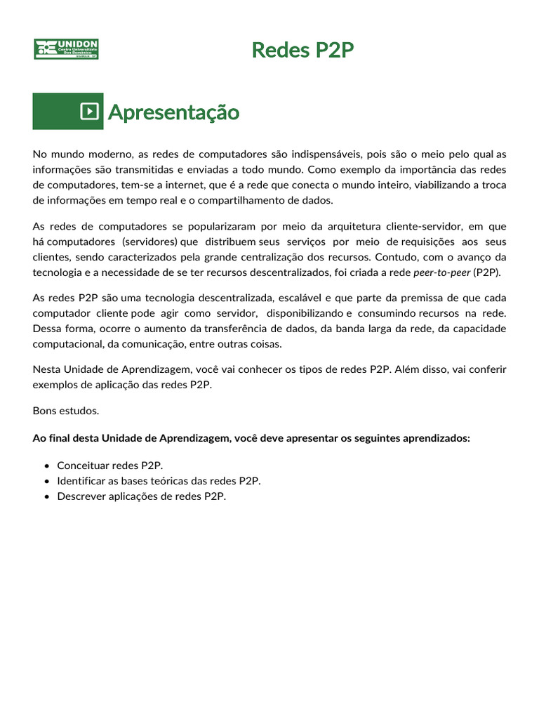 e arquitetura das redes P2P. Além disso, verá exemplos de aplicações práticas