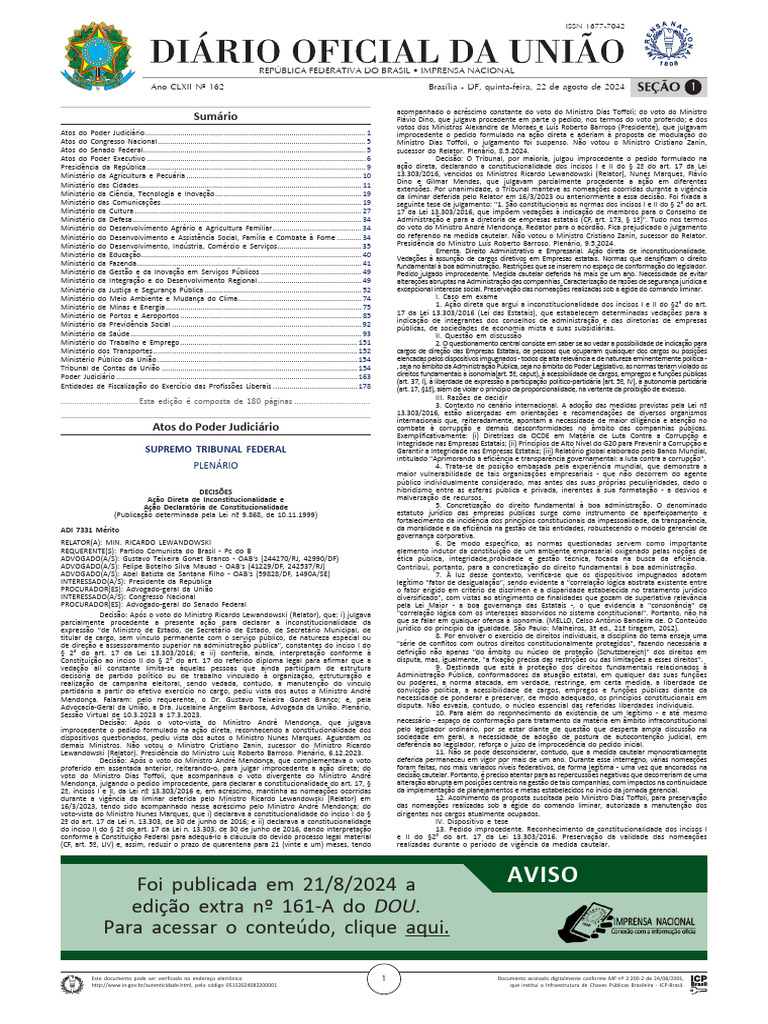 Seção 1 ISSN 1677-7042 Nº 162, quinta-feira, 22 de agosto de 2024