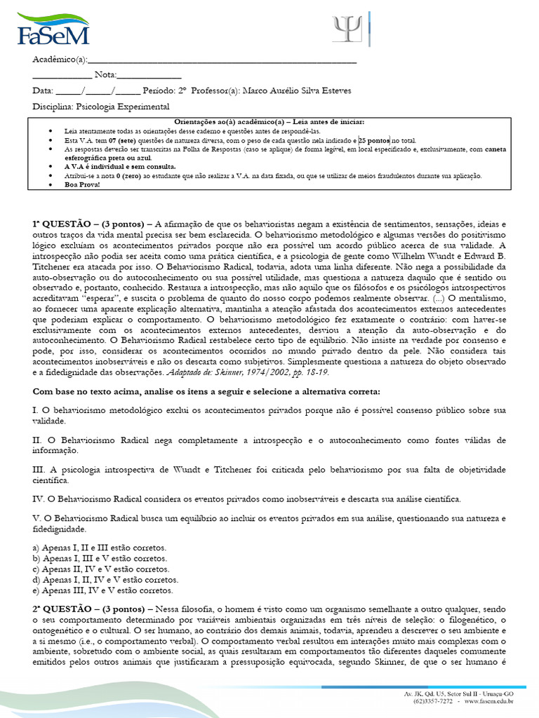 1ª QUESTÃO – (3 pontos) – A afirmação de que os behavioristas negam a existência de sentimentos, sensações, ideias e