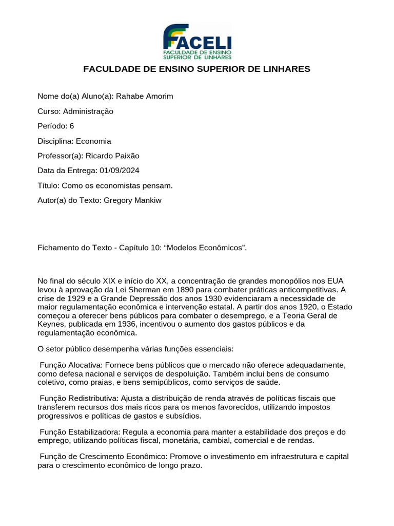 Fichamento do Texto - Capítulo 10: “Modelos Econômicos”.