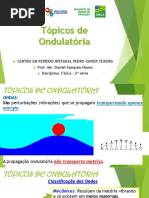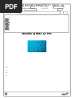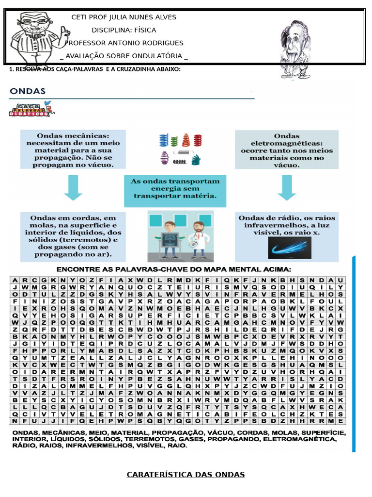 O documento é uma avaliação de Física da disciplina de Ondulatória, ministrada pelo Professor Antonio Rodrigues. Inclui atividades como caça-palavras e cruzadinha relacionadas às características das ondas. O foco é em exercícios que ajudam a entender os conceitos de ondas.
