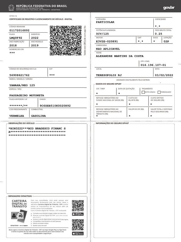OBSERVAÇÕES DO VEÍCULO INFORMAÇÕES DO SEGURO DPVAT