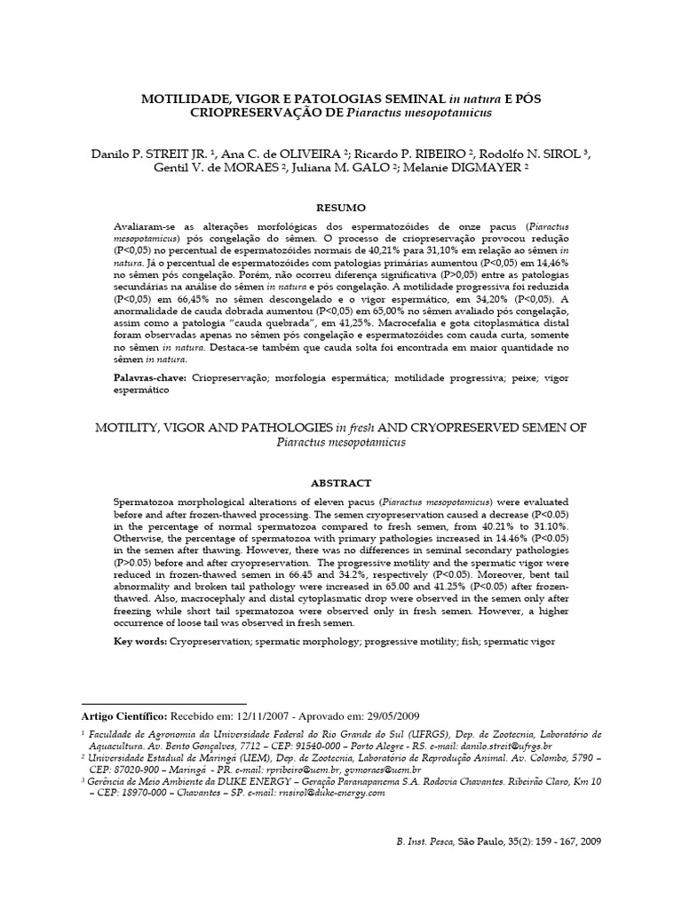 Palavras-chave: Criopreservação; morfologia espermática; motilidade progressiva; peixe; vigor
