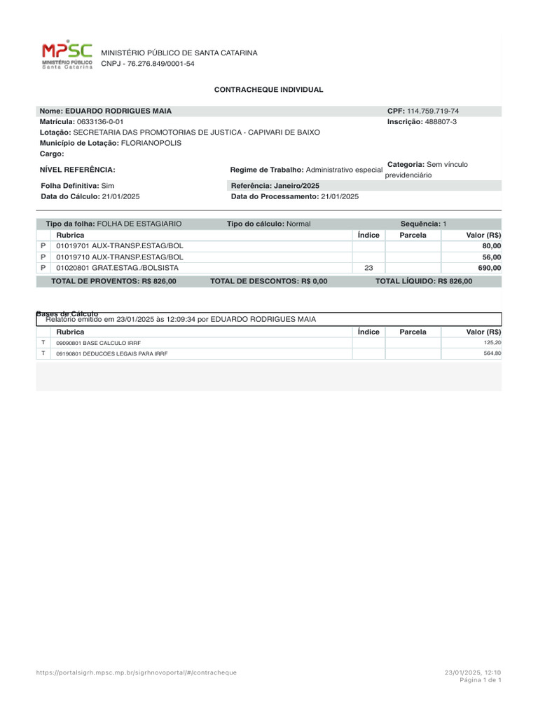 TOTAL DE PROVENTOS: R$ 826,00 TOTAL DE DESCONTOS: R$ 0,00 TOTAL LÍQUIDO: R$ 826,00