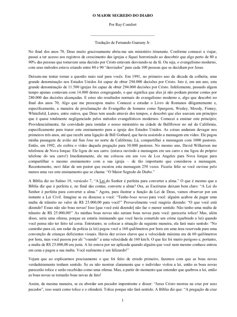 No final dos anos 70, Deus muito graciosamente abriu-me um ministrio itinerante. Conforme comecei a viajar, passei a ter acesso aos registros de crescimento das igrejas e fiquei horrorizado ao descobrir que algo perto de 80 a 90% das pessoas que tomavam uma deciso por Cristo estavam desviando-se da f. Ou seja, o evangelismo moderno, com seus mtodos estava criando entre 80 e 90 desviados para cada 100 pessoas que se decidiam por Jesus. Deixem-me tentar tornar a questo mais real para vocs. Em 1991, no primeiro ano da dcada da colheita, uma grande denominao nos Estados Unidos foi capaz de obter 294.000 decises por Cristo. Isto , em um ano, esta grande denominao de 11.500 igrejas foi capaz de obter 294.000 decises por Cristo. Infelizmente, passado algum tempo apenas contavam com 14.000 destes congregando, o que significa que eles j no podiam prestar contas por 280.000 das decises alcanadas. E estes so resultados normais do evangelismo moderno e, algo que descobri no final dos anos 70; Algo que me preocupou muito. Comecei a estudar o Livro de Romanos diligentemente e, especificamente, a maneira de proclamao do Evangelho de homens como Spurgeon, Wesley, Moody, Finney, Whitefield, Lutero, entre outros, que Deus tem usado atravs dos tempos, e descobri que eles usavam um princpio que quase totalmente negligenciado pelos mtodos evangelsticos modernos. Comecei a ensinar este princpio; Providencialmente, fui convidado para instalar o nosso ministrio na cidade de Bellflower no sul da Califrnia, especificamente para trazer este ensinamento para a igreja dos Estados Unidos. As coisas andaram devagar nos primeiros trs anos, at que recebi uma ligao de Bill Gothard, que havia assistido a mensagem em vdeo. Ele pagou minha passagem de avio at San Jose no norte da Califrnia; L, compartilhei a mensagem com 1000 pastores. Ento, em 1992, ele exibiu o vdeo daquela pregao para 30.000 pastores. No mesmo ano, David Wilkerson me telefonou de Nova Iorque. Ele ligou do seu carro. (estava ouvindo a mensagem em seu carro e me ligou do prprio telefone do seu carro!) Imediatamente, ele me colocou em um voo de Los Angeles para Nova Iorque para compartilhar o mesmo ensinamento com a sua igreja de to importante que considerou a mensagem. Recentemente, ouvi falar de um pastor que escutou esta mensagem 250 vezes. Ficaria feliz se voc ouvisse pelo menos uma vez este ensinamento que se chama: O Maior Segredo do Diabo. A Bblia diz no Salmo 19, versculo 7, A Lei do Senhor perfeita para converter a alma. O que mesmo que a Bblia diz que perfeita e, no final das contas, converte a alma? Ora, as Escrituras deixam bem claro: A Lei do Senhor perfeita para converter a alma. Agora, para ilustrar a funo da Lei de Deus, vamos observar por um instante a Lei Civil. Imagine se eu dissesse a voc: Tenho boas novas para voc: algum acabou de pagar uma multa de trnsito no valor de R$ 25.000,00 para voc! Provavelmente voc reagiria dizendo: O que voc est dizendo? Essas no so boas novas! Isso [que voc est dizendo] no faz o menor sentido. No tenho uma multa de trnsito de R$ 25.000,00! As minhas boas novas no seriam boas novas para voc: pareceria tolice! Mas, alm disso, seria uma ofensa, porque eu estaria insinuando que voc havia cometido um crime (quebrado a lei) quando voc pensa no ter feito tal coisa. Entretanto, se colocar a situao da seguinte maneira, ela far mais sentido: No caminho para c, um radar da polcia (a lei) pegou voc a 160 quilmetros por hora em uma rea reservada para uma conveno de crianas deficientes visuais. Havia dez avisos claros que a velocidade mxima era de 60 quilmetros por hora, mas voc passou por ali voando a uma velocidade de 160 km/h. O que fez foi muito perigoso e, portanto, a multa de R$ 25.000,00 era justa. A lei estava por ser aplicada quando algum que voc nem mesmo conhece entrou em cena e pagou a sua multa. Voc realmente um felizardo! Vejam que ao explicarmos precisamente o que foi feito de errado primeiro, fazemos com que as boas novas verdadeiramente tenham sentido. Se eu no mostrar claramente que o indivduo violou a lei, ento as boas novas parecero tolice e sero recebidas como uma ofensa. Mas, a partir do momento que entender que quebrou a lei, ento as boas novas se tornaro boas novas de fato! Assim, da mesma maneira, se eu abordar um pecador impenitente e disser: Jesus Cristo morreu na cruz por seus pecados, isso soar como tolice e o ofender. Tolice porque no far sentido. A Bblia diz que: A pregao da cruz 1