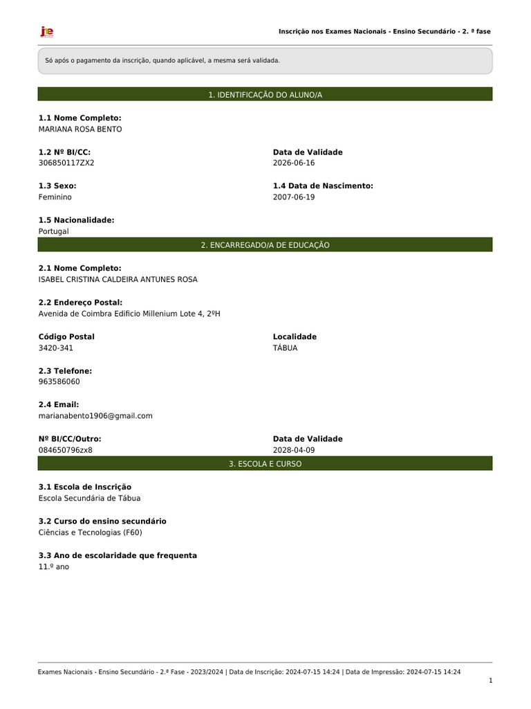 Exames Nacionais - Ensino Secundário - 2.ª Fase - 2023/2024 | Data de Inscrição: 2024-07-15 14:24 | Data de Impressão: 2024-07-15 14:24