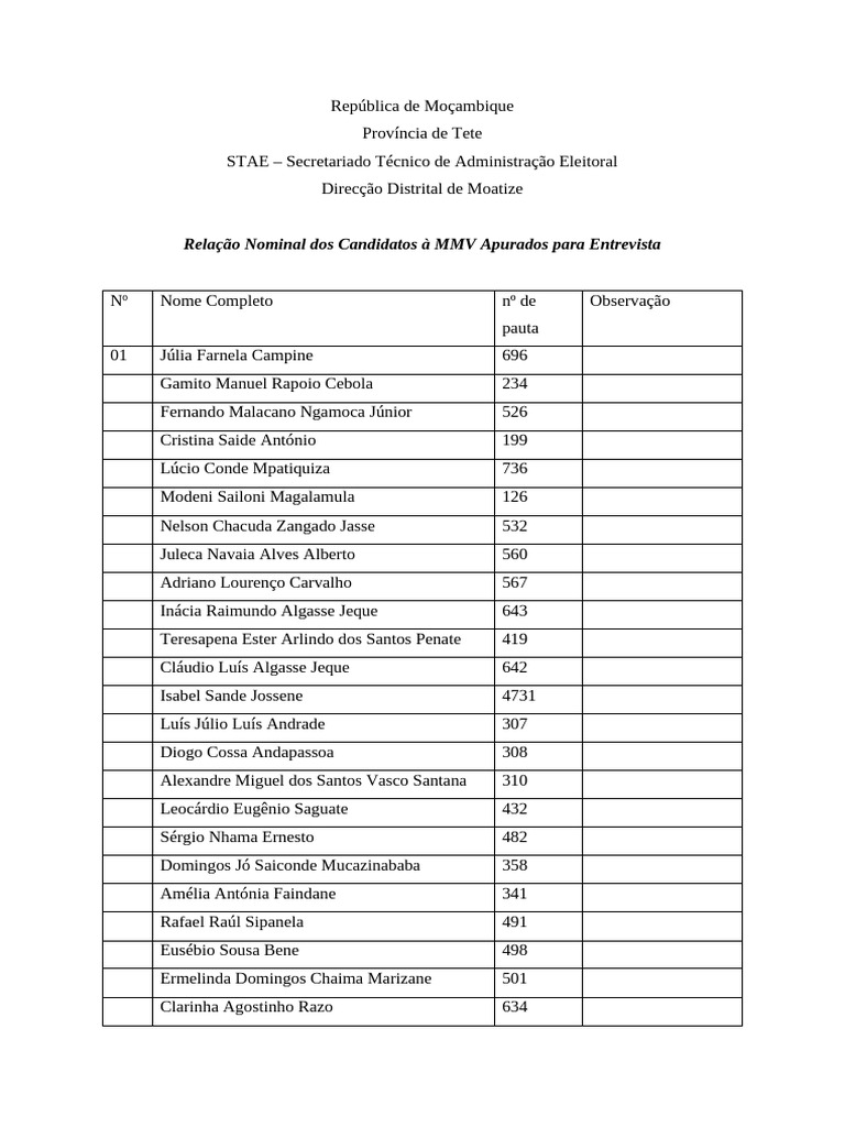 Relação Nominal dos Candidatos à MMV Apurados para Entrevista