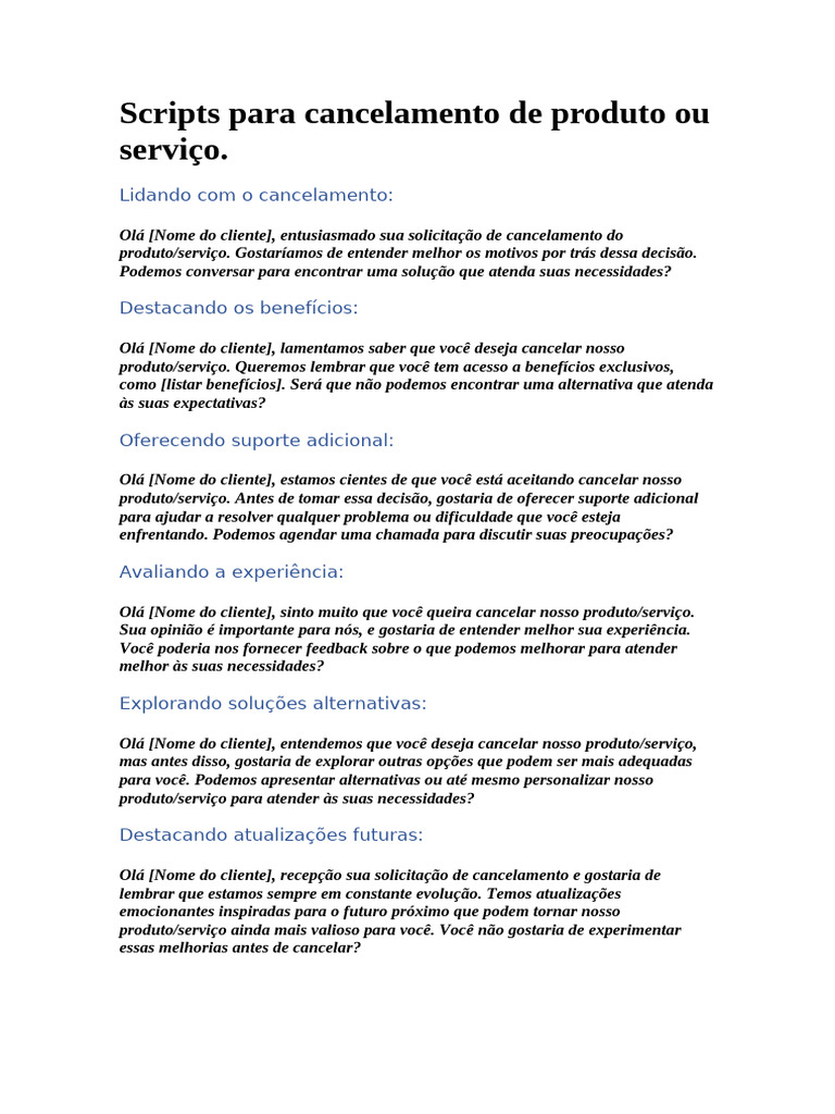 Olá [Nome do cliente], sinto muito que você esteja considerando cancelar nosso