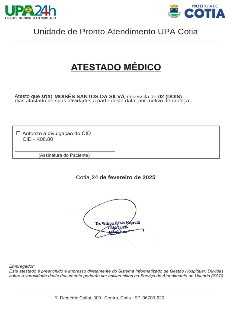 Este atestado é preenchido e impresso diretamente do Sistema Informatizado de Gestão Hospitalar. Duvidas
