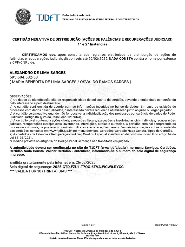 falências e recuperações judiciais disponíveis até 26/02/2025, NADA CONSTA contra o nome por extenso