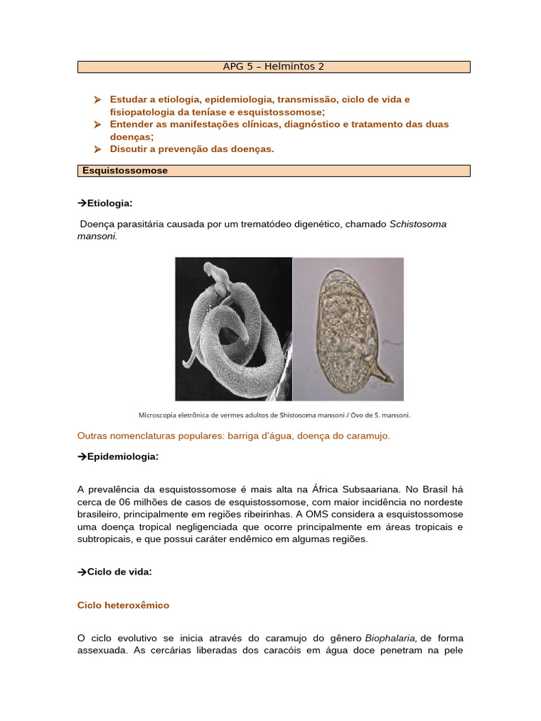 Estudar a etiologia, epidemiologia, transmissão, ciclo de vida e