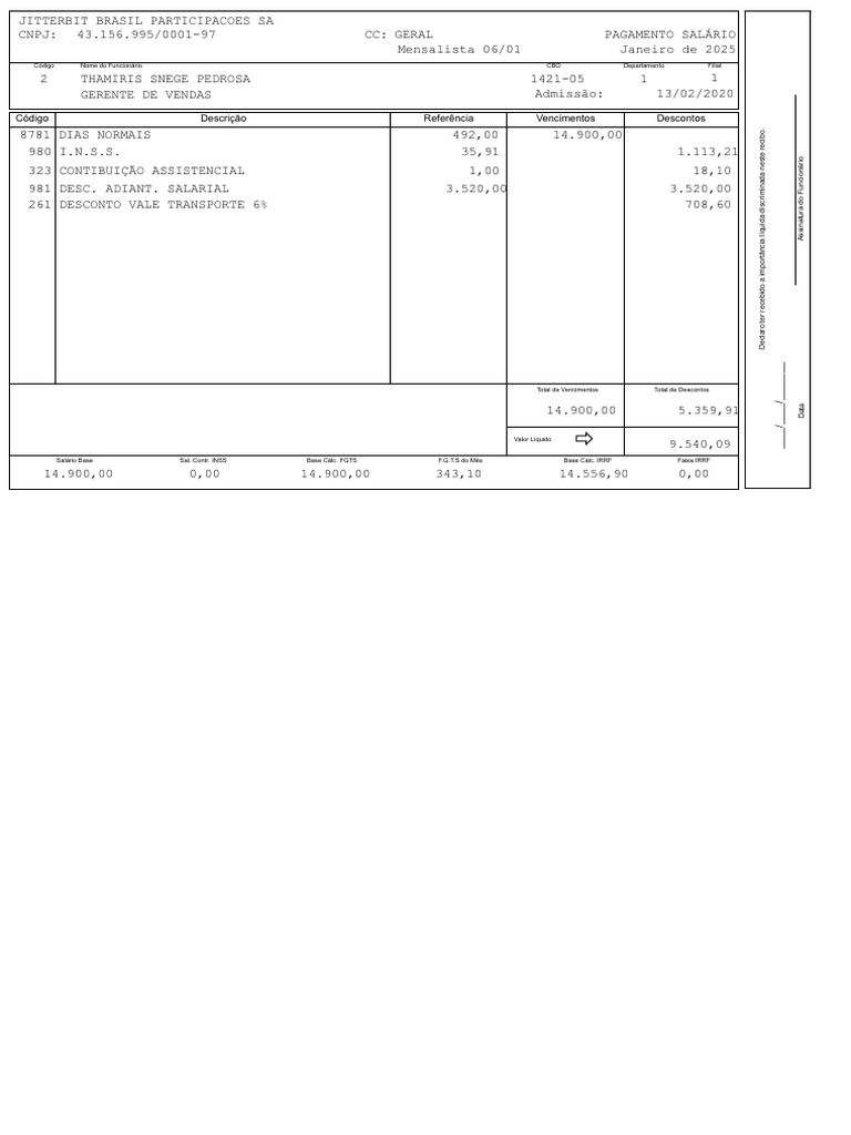 CNPJ: 43.156.995/0001-97 CC: GERAL PAGAMENTO SALÁRIO