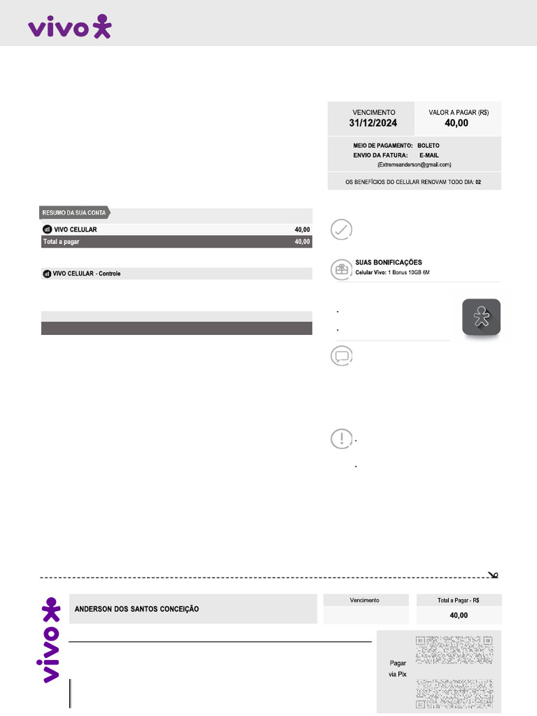 Total a pagar 40,00 Aproveitar os benefícos do Vivo Valoriza