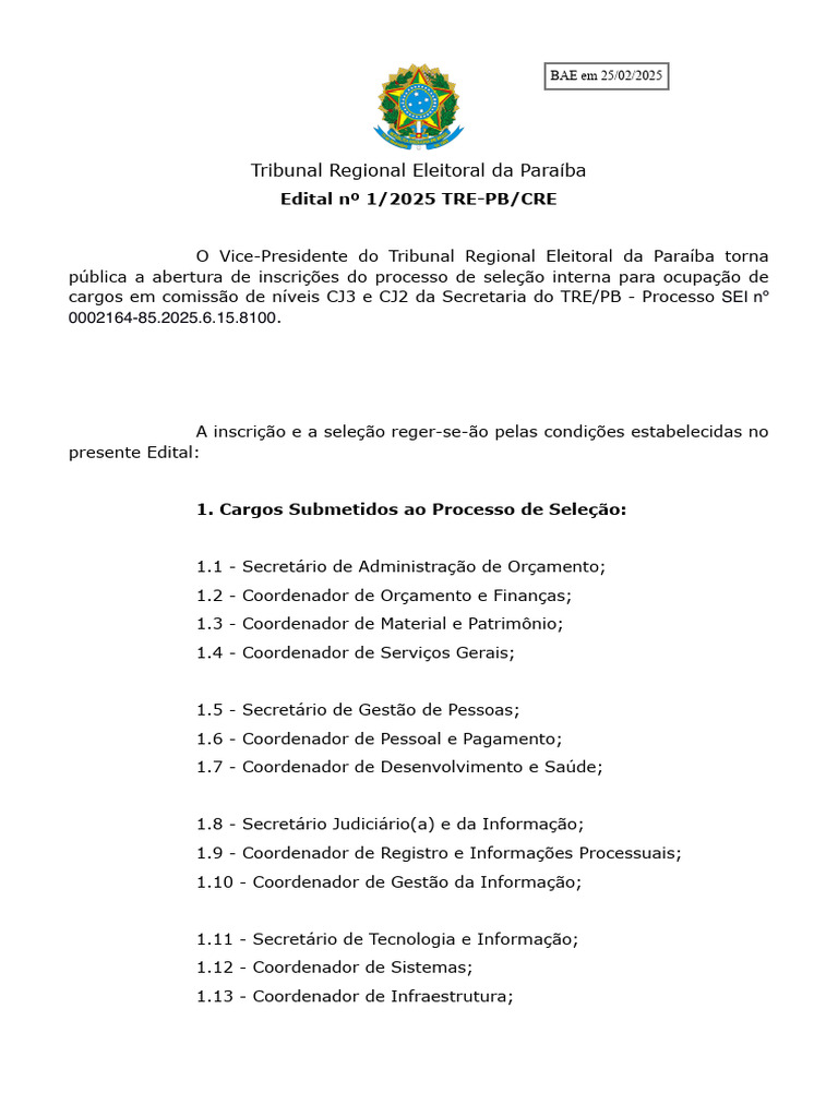 cargos em comissão de níveis CJ3 e CJ2 da Secretaria do TRE/PB - Processo SEI nº