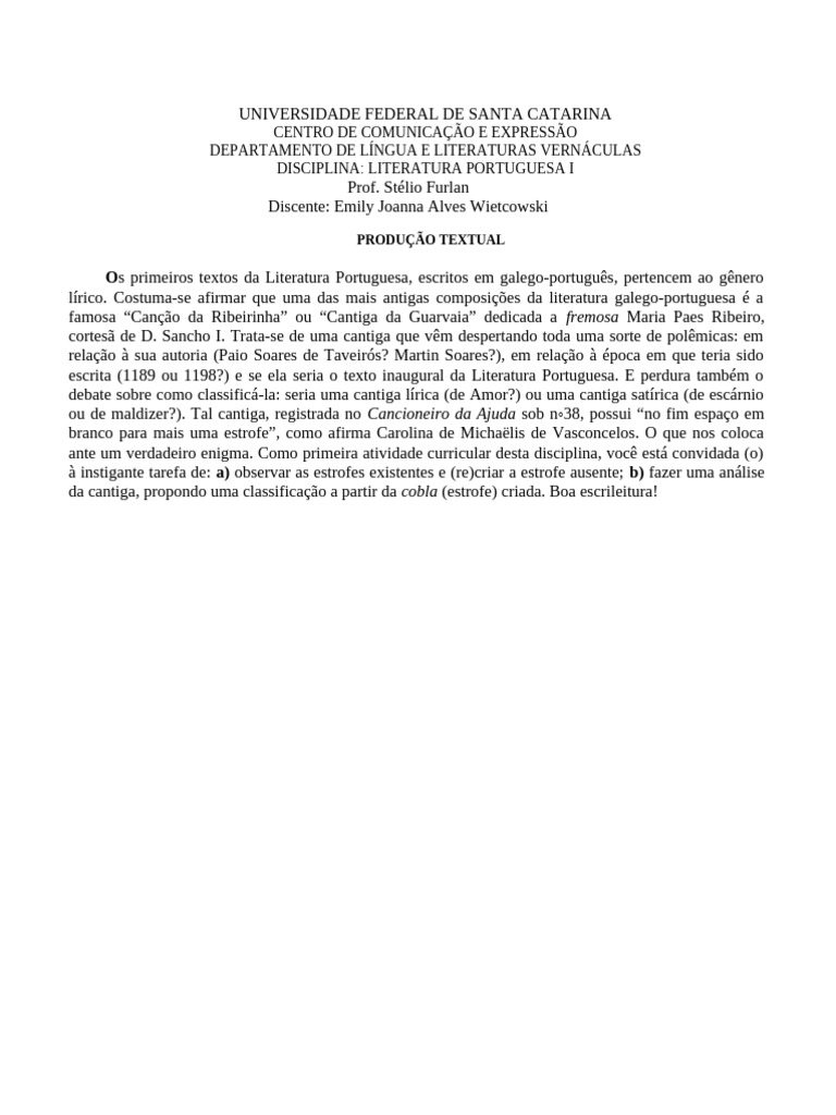 lírico. Costuma-se afirmar que uma das mais antigas composições da literatura galego-portuguesa é a