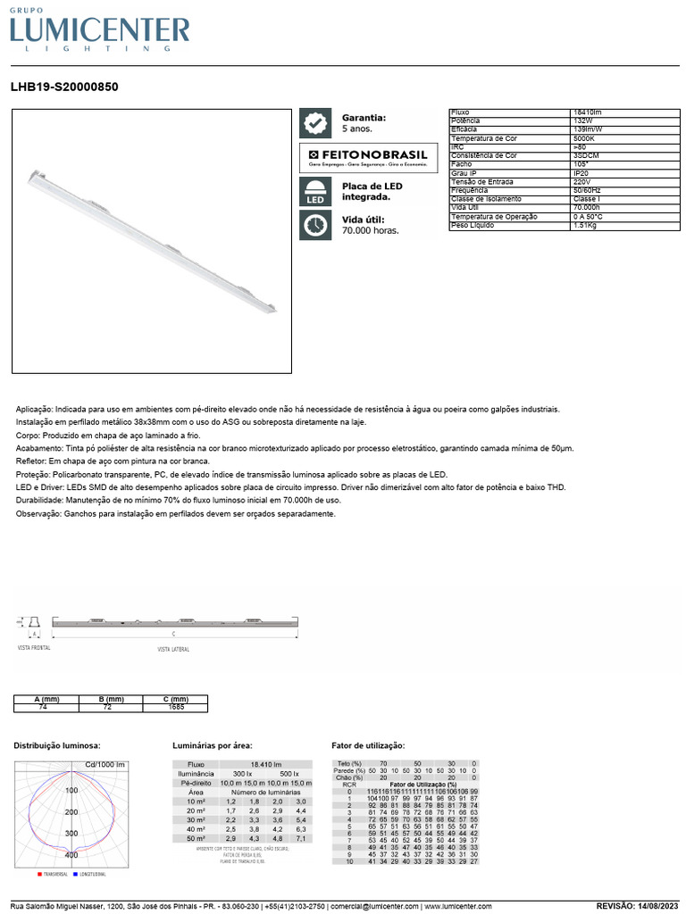 Durabilidade: Manutenção de no mínimo 70% do fluxo luminoso inicial em 70.000h de uso.