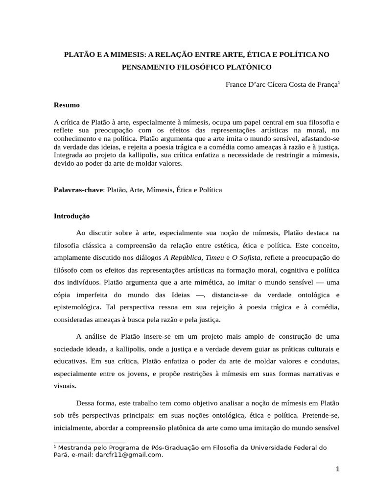 Palavras-chave: Platão, Arte, Mímesis, Ética e Política