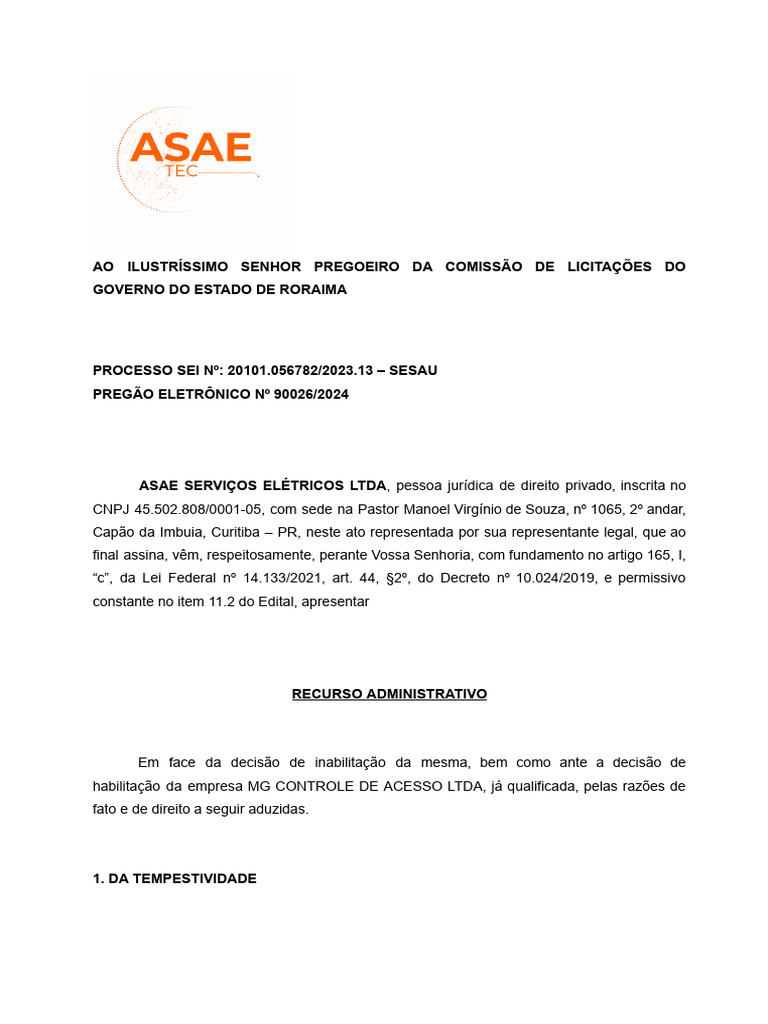 contra a decisão de habilitação da empresa MG, uma vez que o equipamento ofertado não