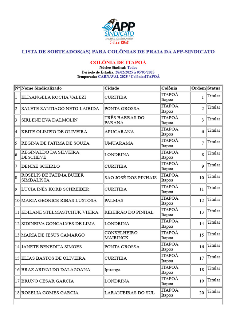 LISTA DE SORTEADOS(AS) PARA COLÔNIAS DE PRAIA DA APP-SINDICATO