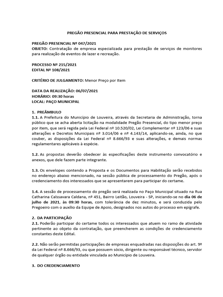 PREGÃO PRESENCIAL Nº 047/2021