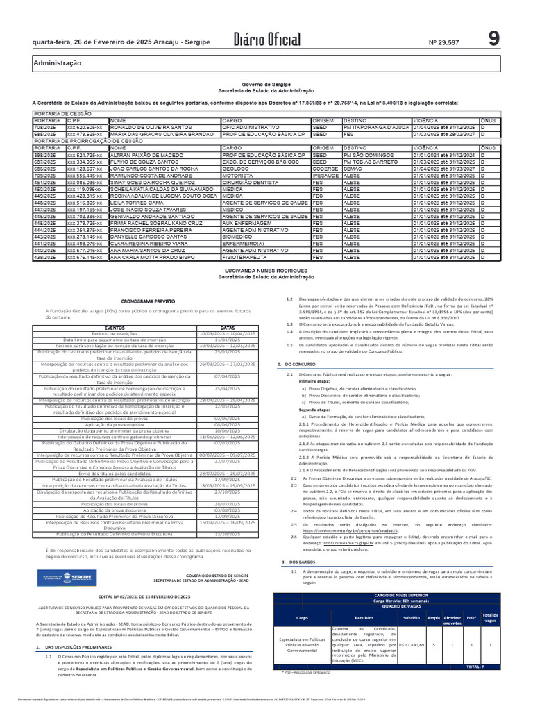 Portarias e Concurso SEAD Sergipe 2025