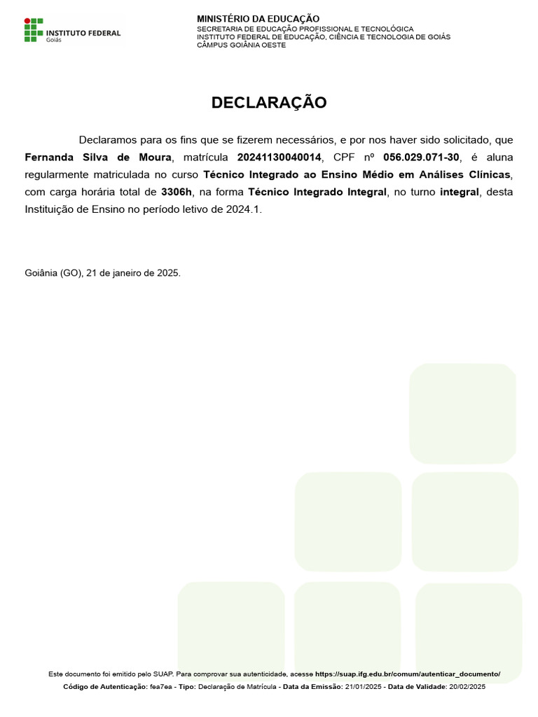 Fernanda Silva de Moura é aluna regularmente matriculada no curso Técnico Integrado ao Ensino Médio em Análises Clínicas no Instituto Federal de Goiás, com carga horária total de 3306 horas. A declaração foi emitida em 21 de janeiro de 2025 e é válida até 20 de fevereiro de 2025. O documento pode ser autenticado através do SUAP.