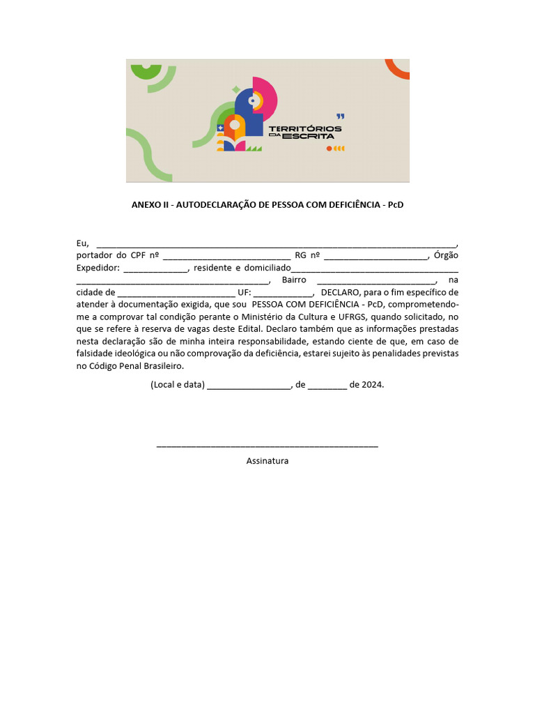 ANEXO II - AUTODECLARAÇÃO DE PESSOA COM DEFICIÊNCIA - PcD