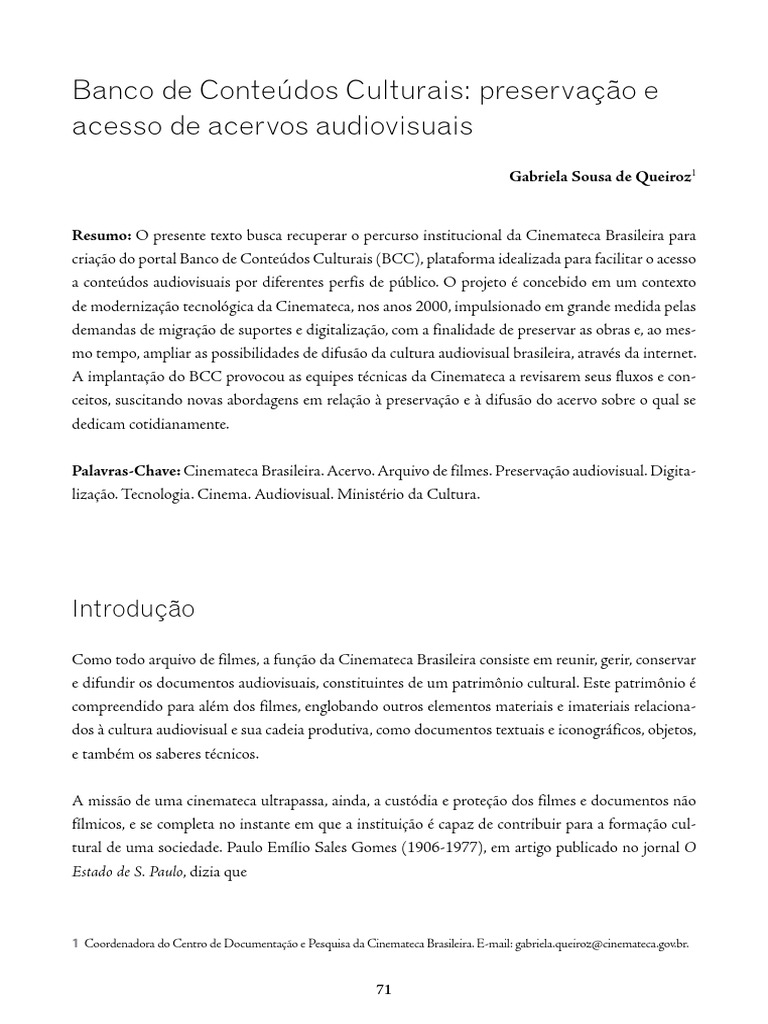 1 Coordenadora do Centro de Documentação e Pesquisa da Cinemateca Brasileira. E-mail: gabriela.queiroz@cinemateca.gov.br.