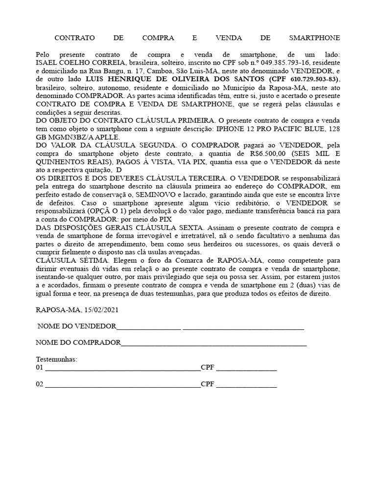 a e acordados, firmam o presente contrato de compra e venda de smartphone em 2 (duas) vias de