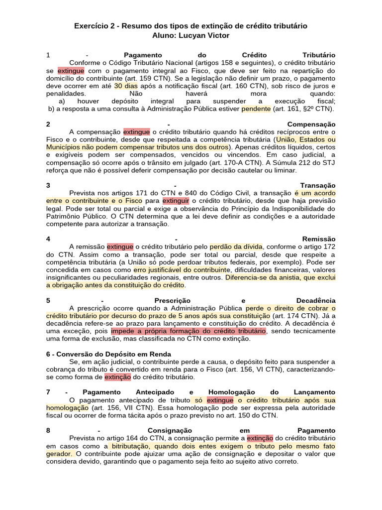 Exercício 2 - Resumo dos tipos de extinção de crédito tributário