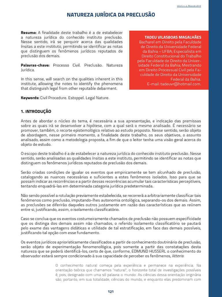O escopo deste trabalho é a de estabelecer a natureza jurídica do conhecido instituto preclusão. Nesse