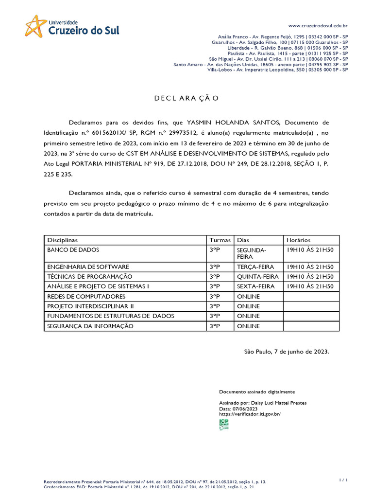 Identificação n.º 60156201X/ SP, RGM n.º 29973512, é aluno(a) regularmente matriculado(a) , no