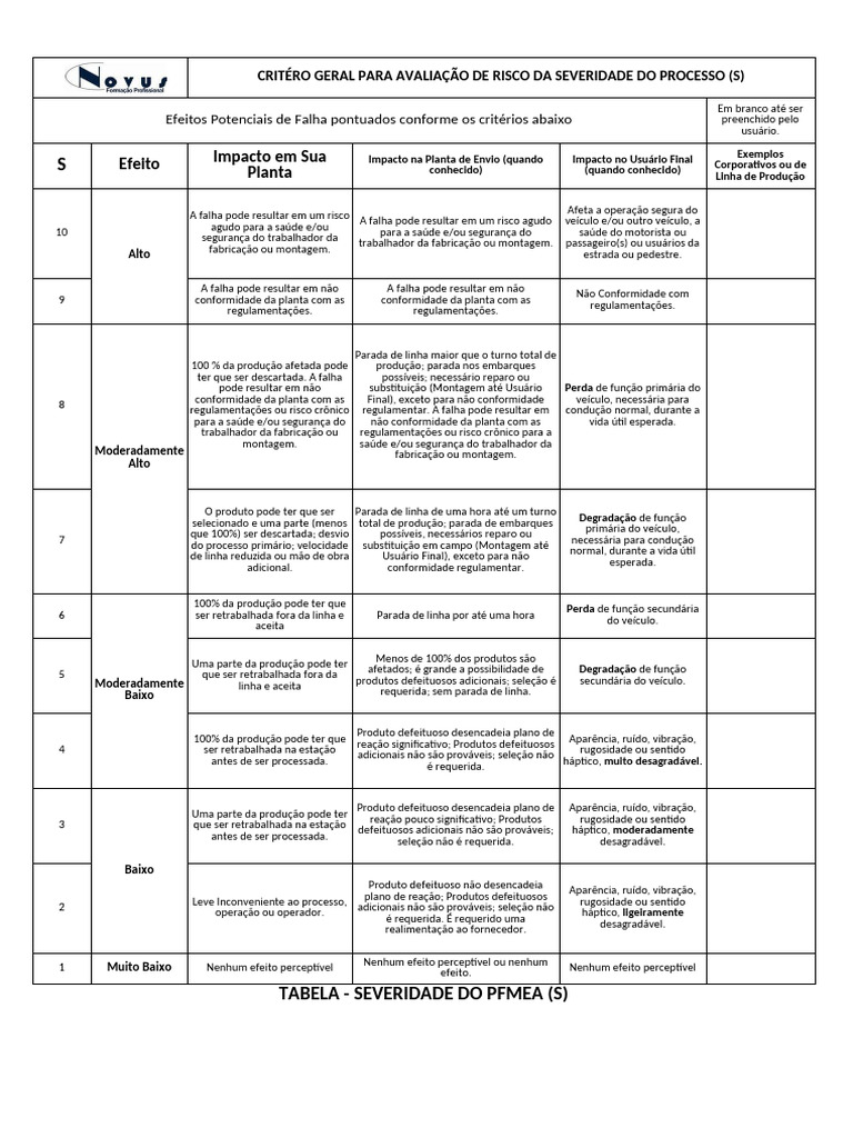 TABELA - SEVERIDADE DO PFMEA (S)
