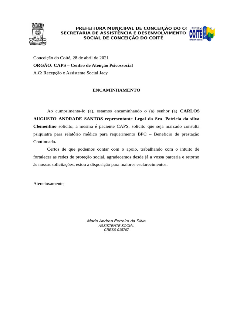 Clementino solicito, a mesma é paciente CAPS, solicito que seja marcado consulta