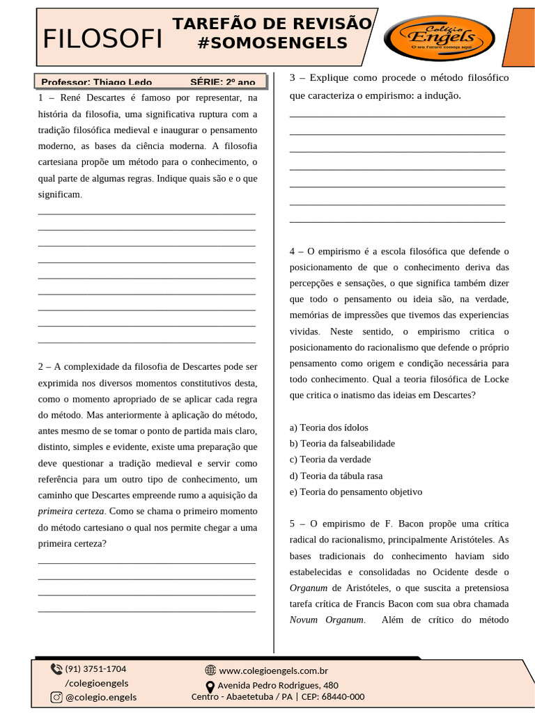 1 – René Descartes é famoso por representar, na que caracteriza o empirismo: a indução.