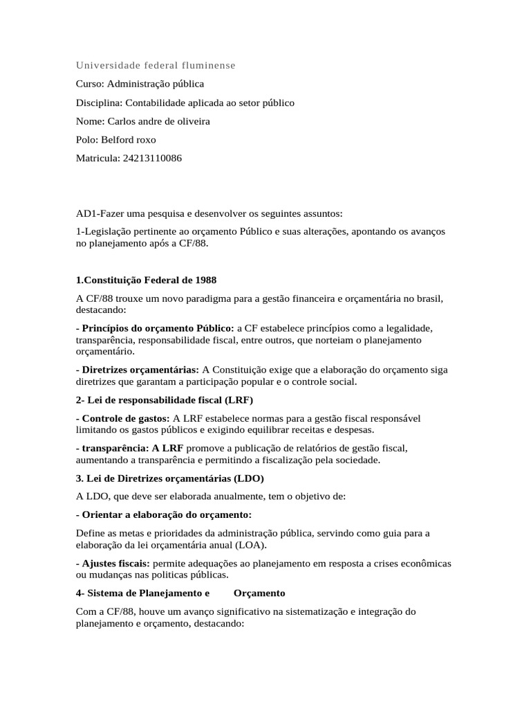 1-Legislação pertinente ao orçamento Público e suas alterações, apontando os avanços
