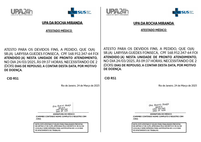ATENDIDO (A) NESTA UNIDADE DE PRONTO ATENDIMENTO, ATENDIDO (A) NESTA UNIDADE DE PRONTO ATENDIMENTO,