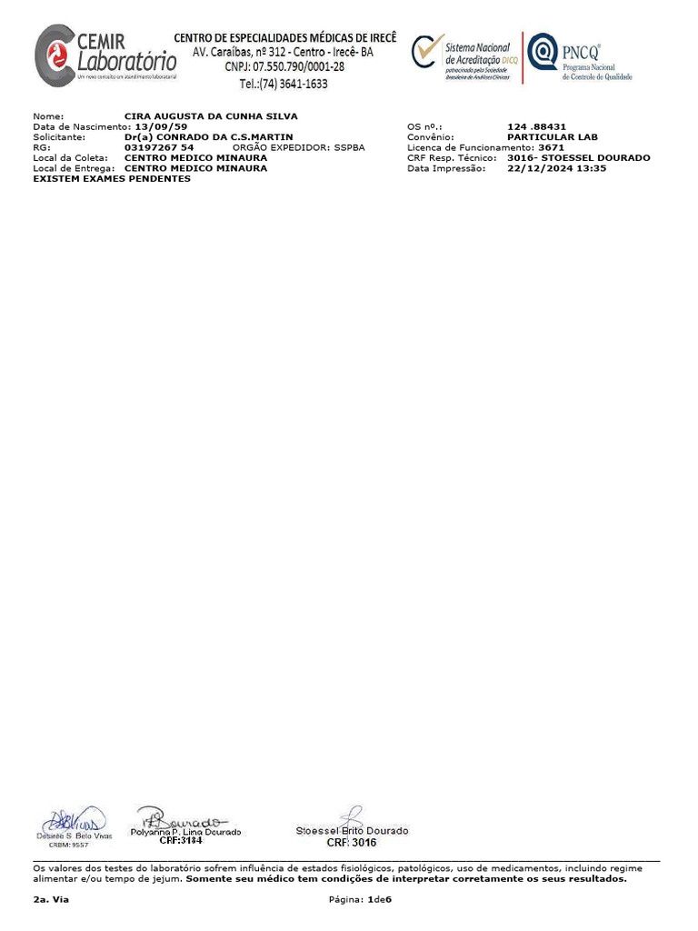 Exame realizado no Laboratório de apoio Hermes Pardini CNES: 6769888