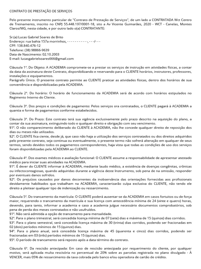 Cláusula 1ª. Do Objeto: A ACADEMIA compromete-se a prestar os serviços de instrução em atividades físicas, a contar