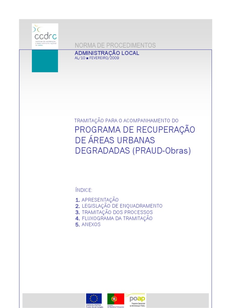O Programa de Recuperao de reas Urbanas Degradadas (PRAUD), traduz-se no apoio aos municpios em operaes de reabilitao ou renovao de reas de vocao urbana. O programa reparte-se por dois segmentos distintos: O PRAUD-OBRAS, financiamento de operaes de reabilitao ou renovao de reas urbanas degradadas, designadamente espaos pblicos, edifcios com identidade histrica ou cultural, infra-estruturas e equipamentos; O PRAUD-GTL, financiamento de aces de preparao e/ou acompanhamento de operaes de reabilitao ou renovao de reas urbanas, no mbito do qual o Estado apoia os Gabinetes Tcnicos Locais (GTL) criados junto das autarquias para elaborao de estudos, projectos e planos, actos necessrios e preparatrios da operao de recuperao. A definio do quadro normativo do programa bem como a seleco das candidaturas so da responsabilidade do Ministrio do Ambiente, Ordenamento do Territrio e do Desenvolvimento Regional (MAOTDR). A gesto financeira e coordenao nacional do programa so asseguradas pela Direco-Geral do Ordenamento do Territrio e Desenvolvimento Urbano (DGOTDU). Comisso de Coordenao e Desenvolvimento Regional do Centro (CCDRC) compete, por sua vez, a apreciao de candidaturas e o acompanhamento da execuo fsica e financeira dos protocolos celebrados com os municpios. Para esse efeito, alm de contemplar as orientaes definidas na legislao em vigor, esta Norma introduz diversos procedimentos que visam racionalizar e tornar mais objectivo e transparente o processo de apreciao e acompanhamento dos Projectos do Programa de Recuperao de reas Urbanas Degradadas, por parte da CCDRC. Nesta Norma sistematizam-se sob a forma descritiva e de fluxograma as etapas, passos, contedos e responsveis, da tramitao do acompanhamento destes protocolos.