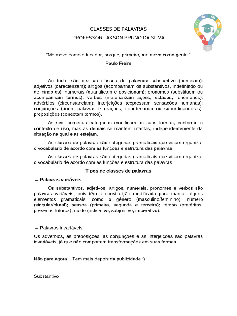 Ao todo, são dez as classes de palavras: substantivo (nomeiam);