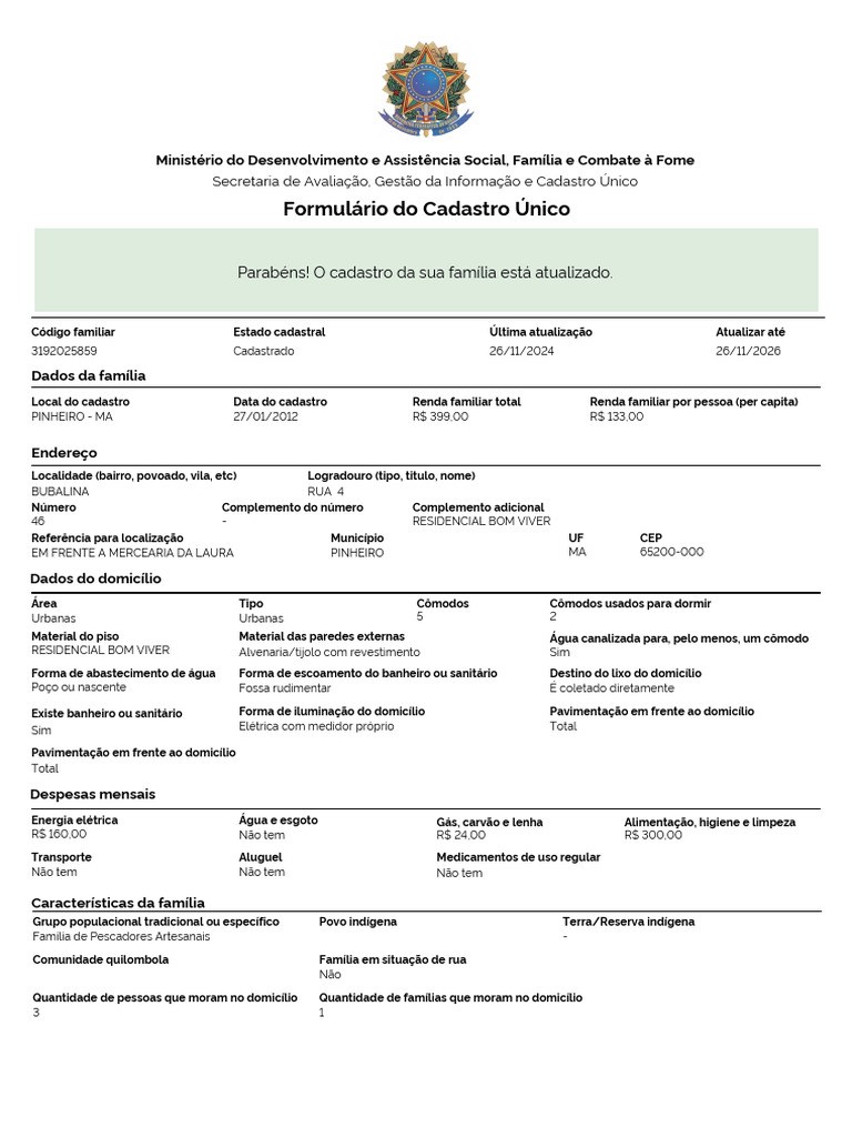 Código familiar Estado cadastral Última atualização Atualizar até
