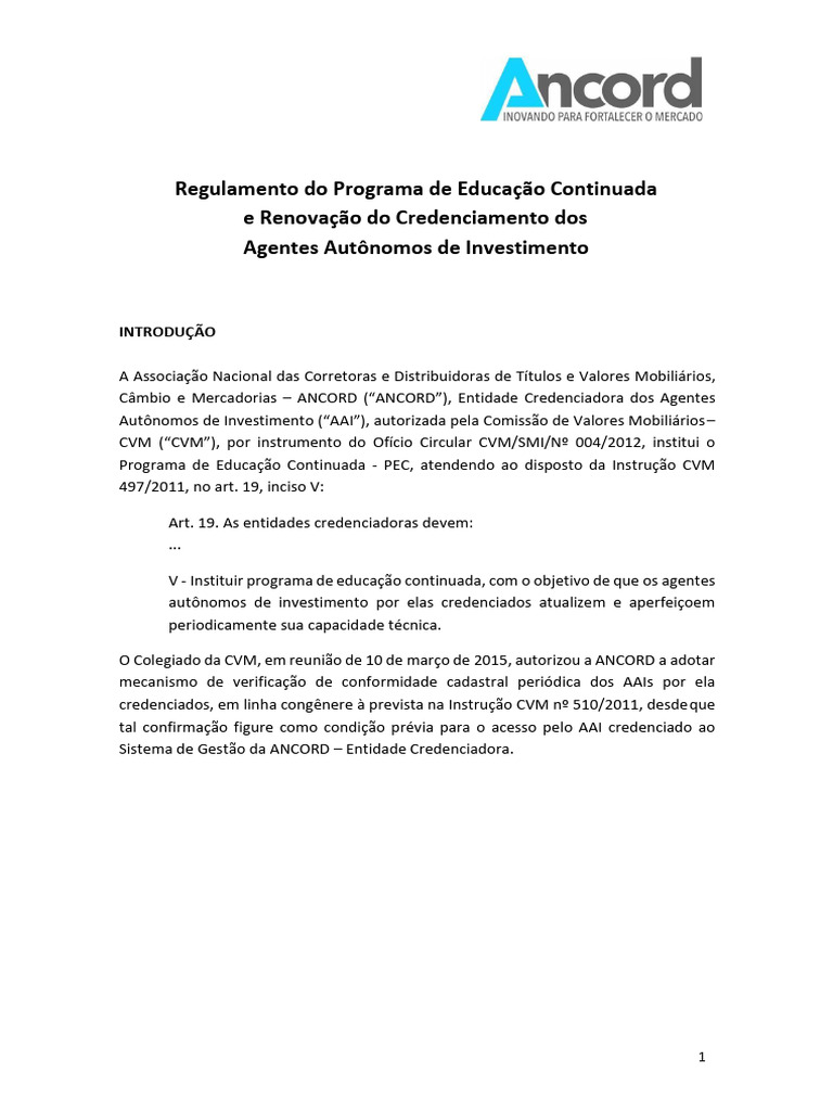 O Colegiado da CVM, em reunião de 10 de março de 2015, autorizou a ANCORD a adotar