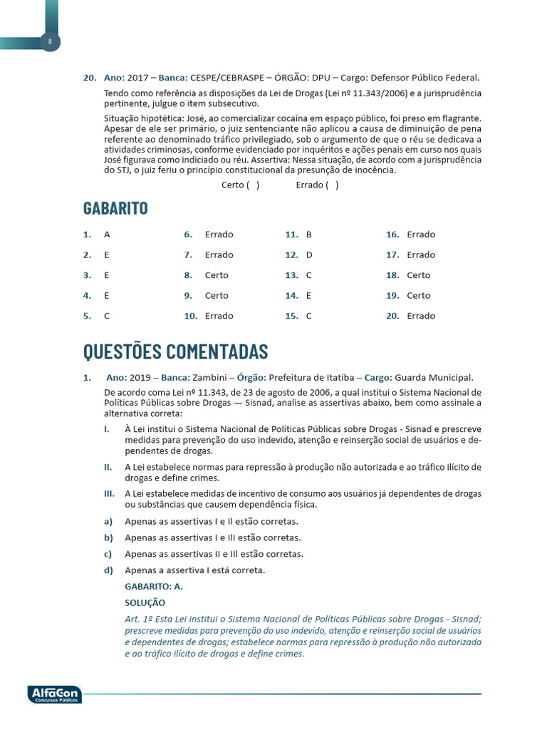 enunciado e considerando a Lei nº 11.343/2006, analise as assertivas a seguir, assinalando V,