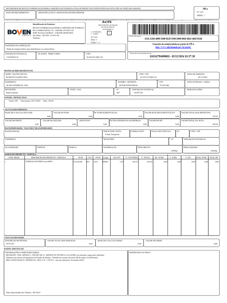 BOVEN COMERCIALIZADORA VAREJISTA DE ENERGIA LTDA DA NOTA FISCAL
