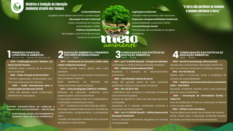 Primeira organização ambientalista com Meio Ambiente ( PNUMA ). 📌 1988 – Constituição Federal do Brasil conceito de sustentabilidade.