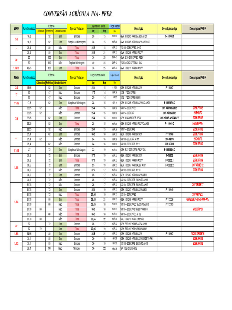 EIXO Furo Quadrado Tipo de Vedação Descrição Descrição Antiga Descrição PEER