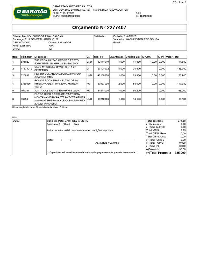 OBS.: Condição Pgto: CART DEB A VISTA Total dos Itens 371,50